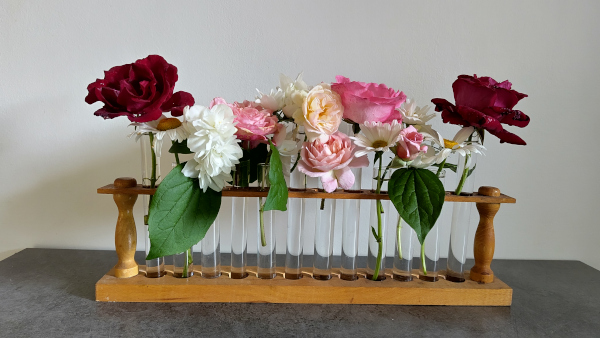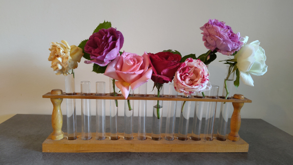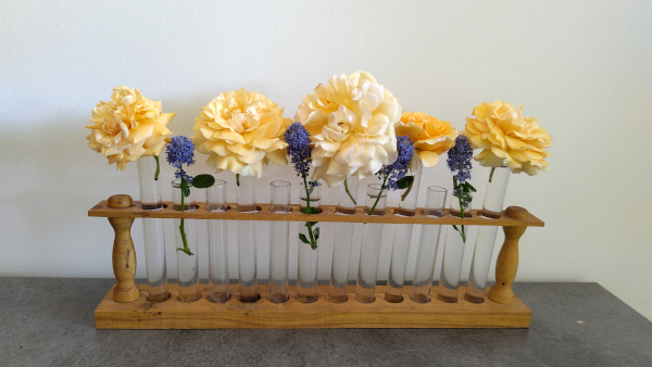 J'ai fourni le présentoir et les tubes, le tout chiné en vide-grenier. Cécile s'occupe de joliment les remplir de fleurs, elle a un art consommé de cela.