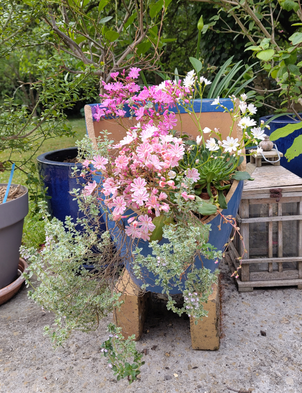 Des lewisias - achetées au gars qui ne fait que des succulentes à Saint-Jean-De-Beauregard - ont été disposées et accompagnent une aromatique.